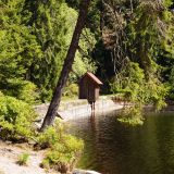 Ein Eiszeitgletscher hat diesen Karsee aus dem Buntsandstein herausgehobelt. Er diente einst den Flößern als Schwellweiher, um mit dem angestauten Wasser die gefällten Stämme zu Tal zu schwemmen.