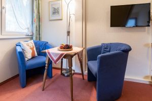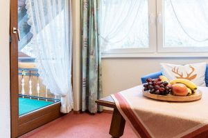Auch unser Gästezimmer 5 viel Platz für zwei Personen. Eine gemütliche Sitzecke und der eigene Balkon laden ein zum Entspannen.